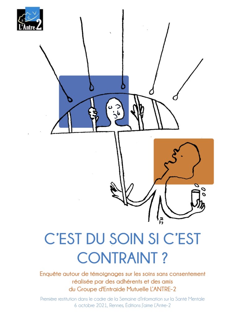 En juillet dernier, je partageais avec vous ce projet auquel je tiens beaucoup. Il s’agit d’une initiative menées par des adhérents du Groupe d’Entraide Mutuelle (GEM) L’Antre-2, à laquelle je participe, visant à collecter et diffuser des témoignages d’expériences de « soins » sans consentement (nous préférons les appeler « soins » contraints). Le 6 octobre dernier, nous avons proposé une première restitution publique des témoignages.